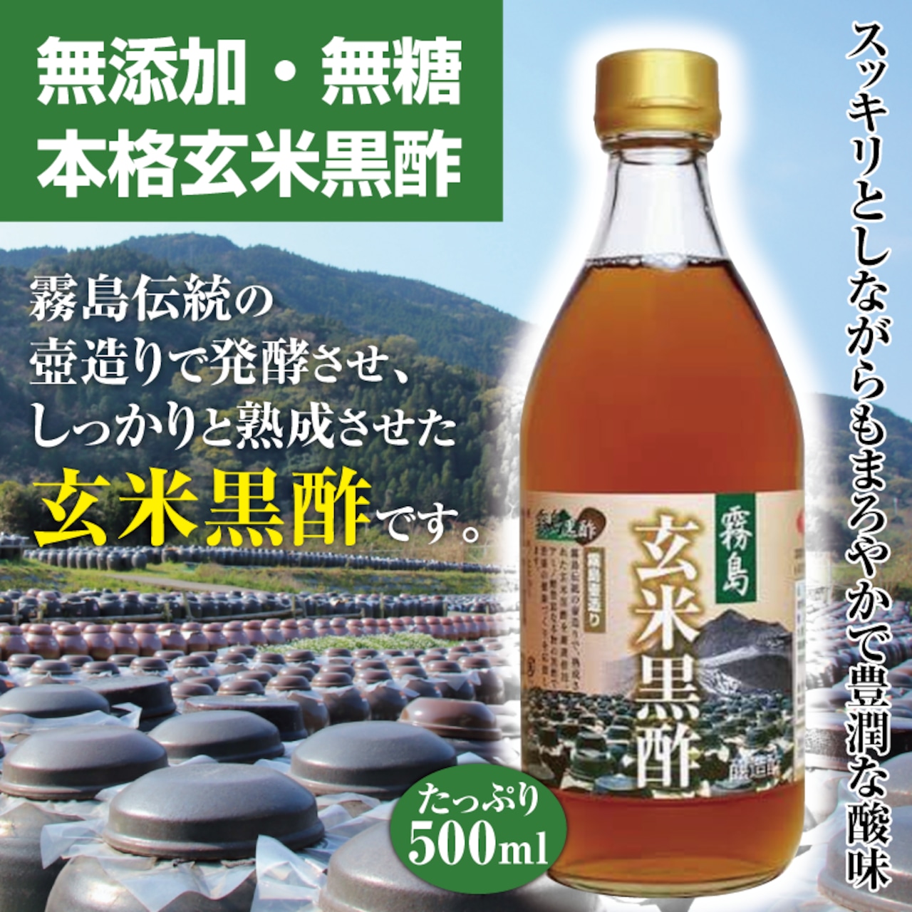 霧島伝統の壺造りで発酵させ、しっかりと熟成させた玄米黒酢です。私達の体の一番基本になる栄養素であるアミノ酸が豊富で、各種有機酸やミネラル・ビタミン類も沢山含まれています。スッキリとしながらもまろやかで豊潤な酸味は、お料理など様々にご活用頂けます。